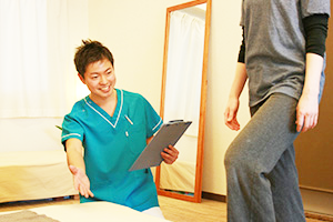 カウンセリングの情報を基に、痛みの出る動きの確認や体の動かし方、骨格のバランス、筋肉や関節の状態などを診て原因を特定していきます。