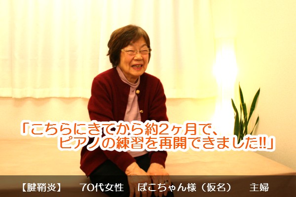 病院で腱鞘炎が悪化し、鍼でもなかなか良くならずご来院されたぽこちゃん様(仮名)。ピアノが弾けるまで回復した経緯をお伺いしました。